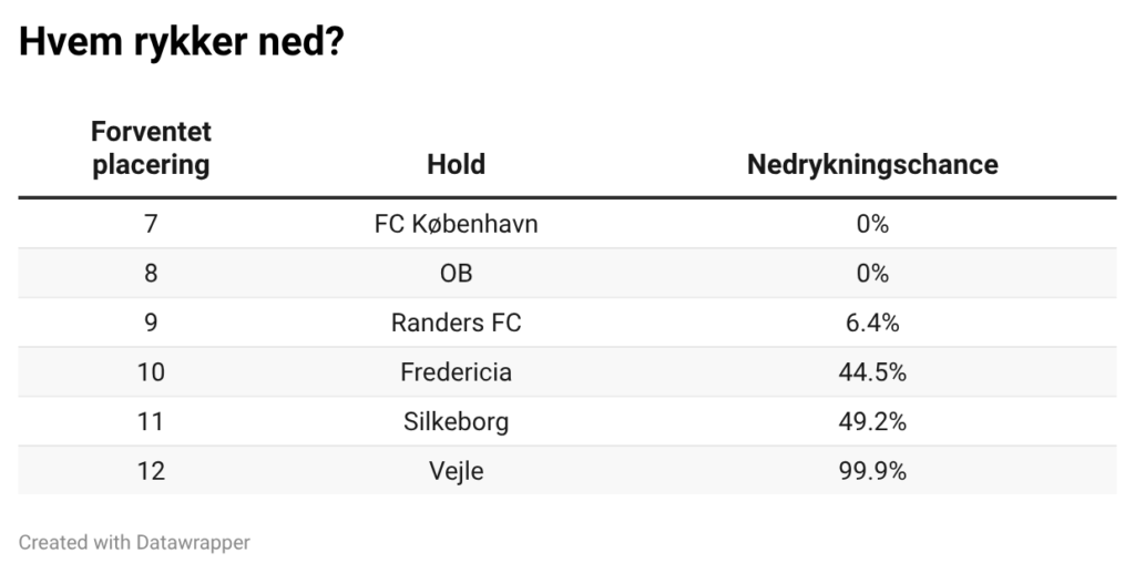 Til gengæld er Randers’ chancer for overlevelse store. Kronjyderne gives kun 6,4 procents chance for nedrykning.